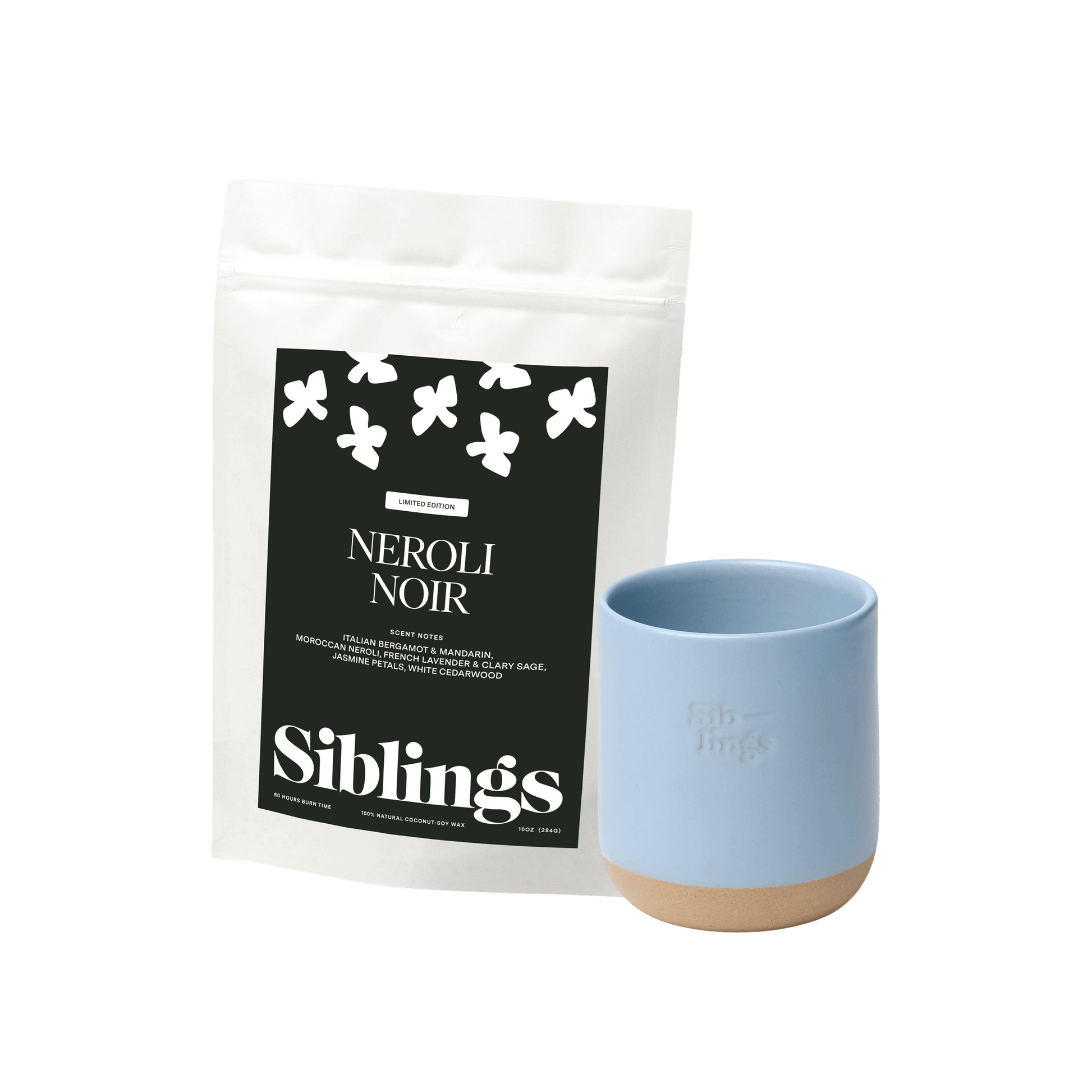 A fresh, seasonal pairing inspired by Mediterranean light, blooming gardens, and the feeling of warmth returning after winter. Bright citrus, soft florals, and grounding woods come together in our Neroli Noir Clean Candle Refill, paired with a handcrafted Forever Vessel in Sky, made to be refilled and reused—season after season.
